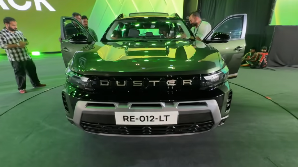 फ्रंट लुक काफी लंबा-चौड़ा और मस्कुलर है. हूड और बड़े ग्रिल के डिज़ाइन में DUSTER बैजिंग को प्रमुखता से रखा गया है, जो यूनिक अपील देता है. बम्पर और स्किड प्लेट रिस्की ऑफ-रोड टोन दे रहे हैं, जबकि क्लैडिंग और बॉडी पैनल्स पर ऑफ-रोड एलिमेंट्स अच्छी तरह से दिखते हैं.